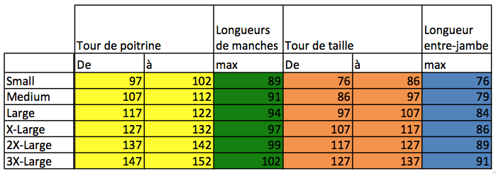 Tailles : S/M/L - attention taille très grand - prendre une taille en dessous de votre taille habituelle. Voir tableau ci-dessous :